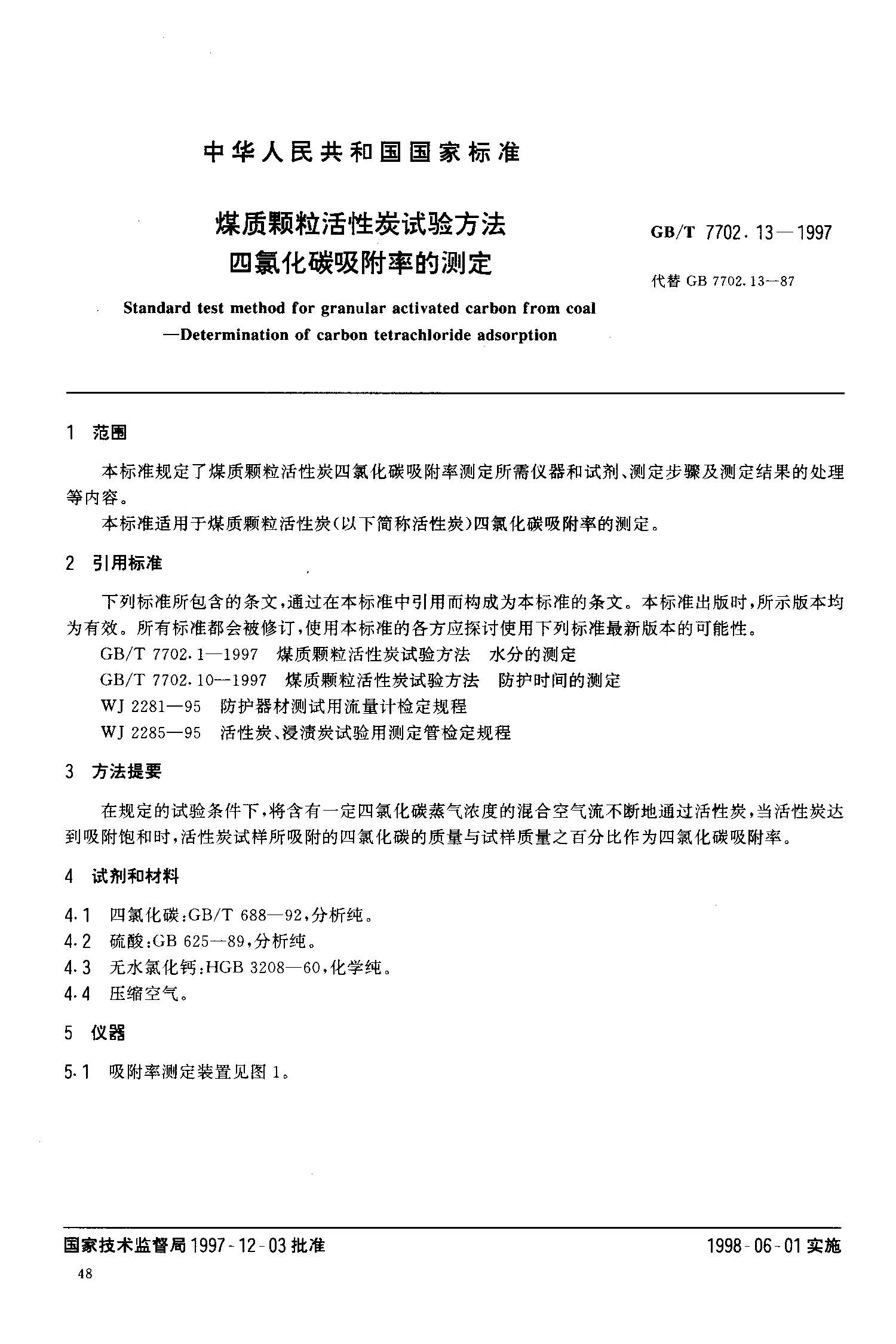 【GBT 7702.13-1997 煤質顆粒活性炭試驗方法 四氯化碳吸附率的測定】
